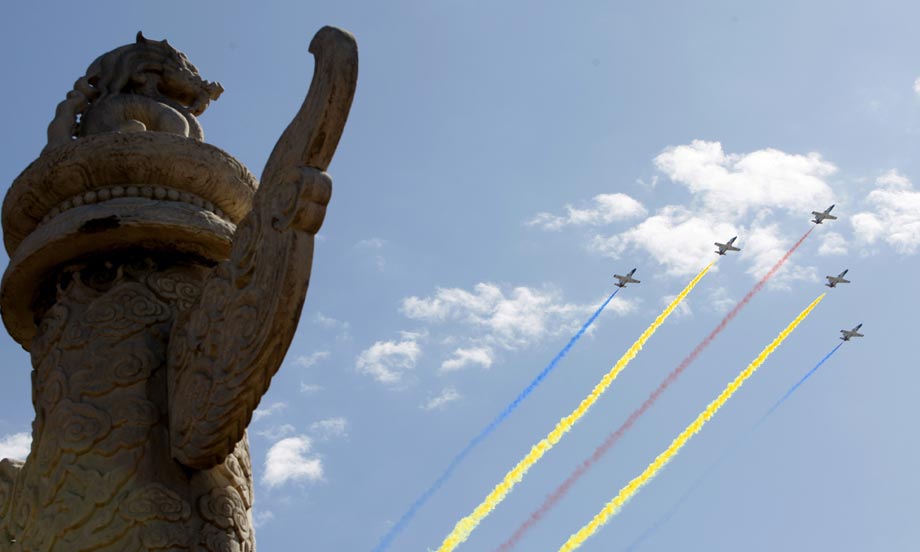 2009年10月1日,首都各界慶祝中華人民共和國成立60周年大會(huì)在北京舉行。空中方隊(duì)在北京上空駛過。