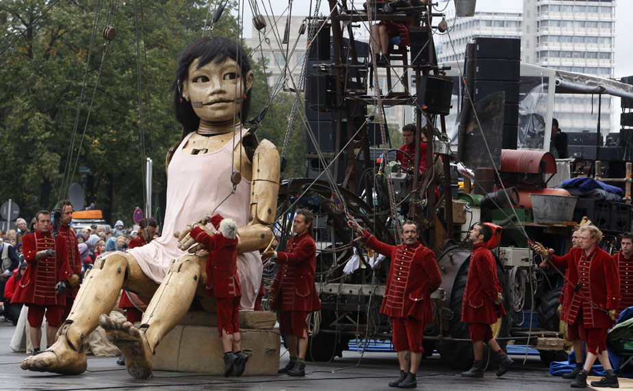 10月2日,來自法國一家戲劇公司的兩個(gè)巨型提線木偶亮相柏林街頭,它們將在露天劇場進(jìn)行表演,以此紀(jì)念柏林墻推倒20周年。