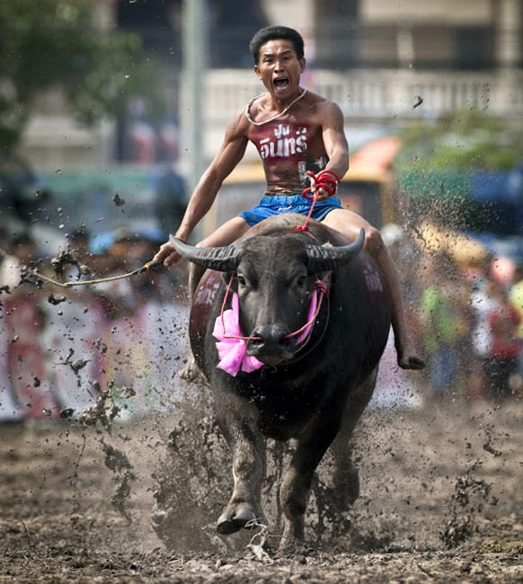 10月3日,泰國(guó)一年一度的騎水牛大賽在春武里舉行。