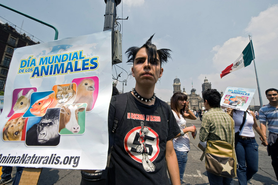 10月4日,在墨西哥首都墨西哥城,參加世界動(dòng)物日活動(dòng)的人們頭帶面具,手舉圖片,呼吁人們關(guān)注動(dòng)物權(quán)益。來(lái)源:中國(guó)新聞網(wǎng)