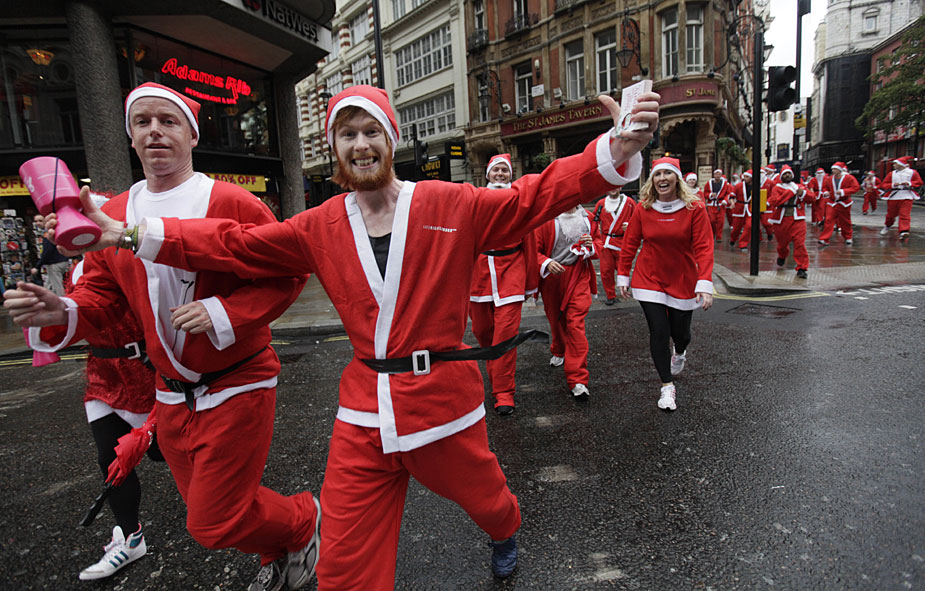 10月6日,英國(guó)倫敦市中心100多位圣誕老人為籌集乳腺癌護(hù)理善款而參加歡樂(lè)跑活動(dòng)。圖片來(lái)源:中國(guó)新聞網(wǎng)