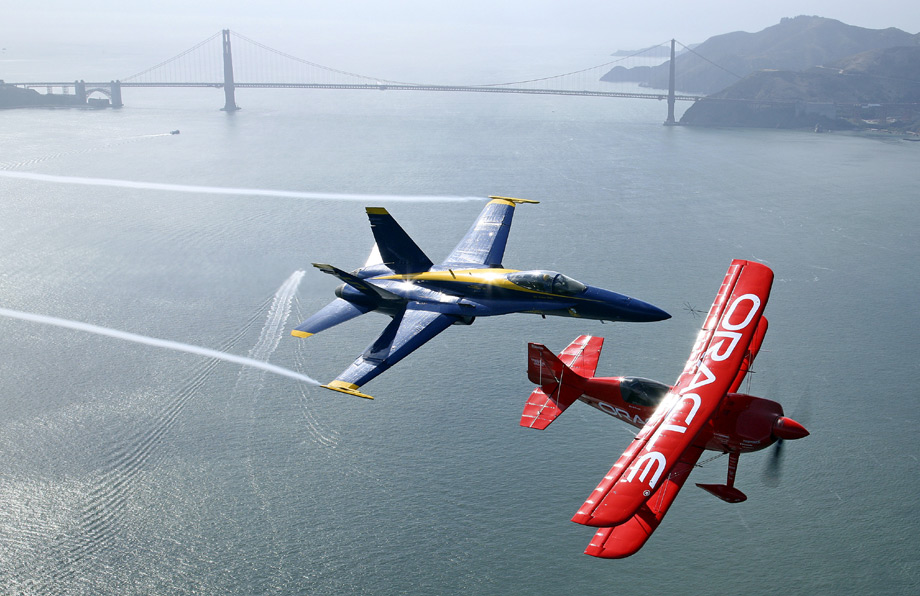 2009年10月8日,美軍飛機(jī)在舊金山灣上空進(jìn)行飛行演練。一年一度的舊金山艦隊(duì)周將于10月10日開幕,屆時(shí)會(huì)有船艦游行和飛行表演等活動(dòng)。 來(lái)源:中國(guó)新聞網(wǎng)