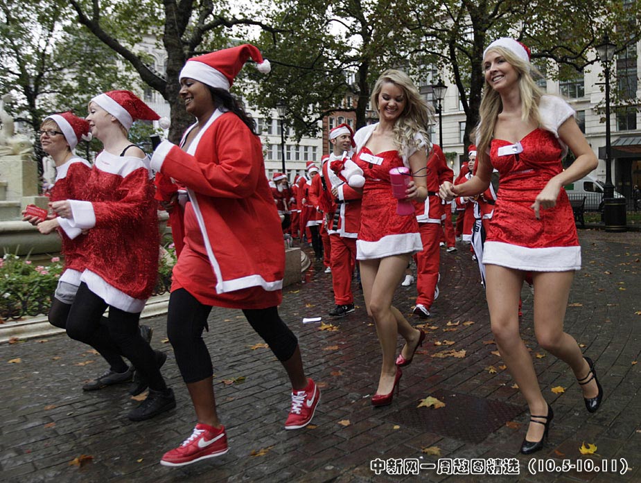 10月6日,英國(guó)倫敦市中心100多位圣誕老人為籌集乳腺癌護(hù)理善款而參加歡樂跑活動(dòng)。來源:中國(guó)新聞網(wǎng)