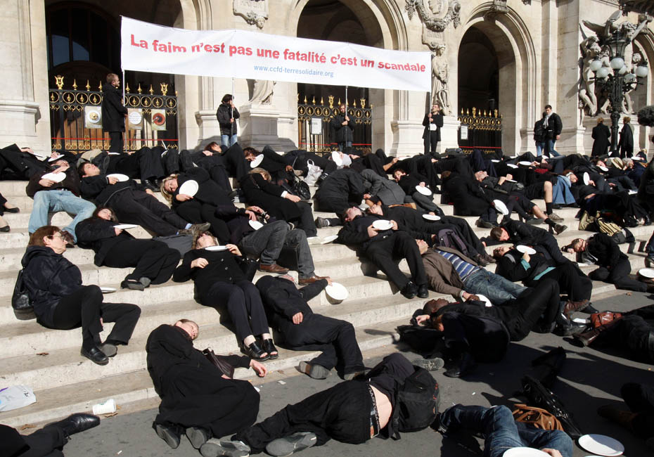 10月15日,示威者身穿黑色衣服、手持空盤子在巴黎歌劇院前抗議。他們此舉是為了呼吁人們關注世界上的饑民。圖片來源:中國新聞網(wǎng)
