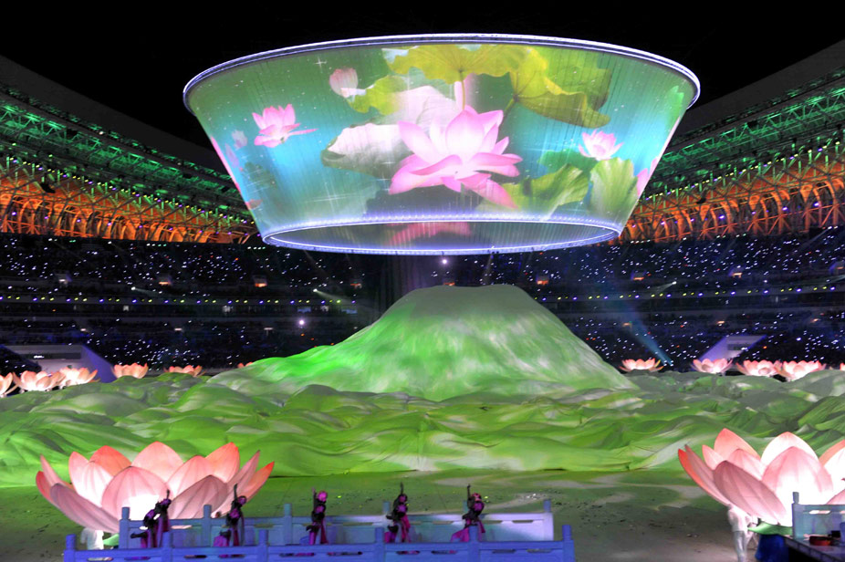 十月十六日晚,中華人民共和國第十一屆運(yùn)動(dòng)會(huì)在山東濟(jì)南奧體中心隆重開幕。圖為文藝晚會(huì)上的“巨碗”視頻演繹和平、和諧。中新社發(fā) 陳文 攝