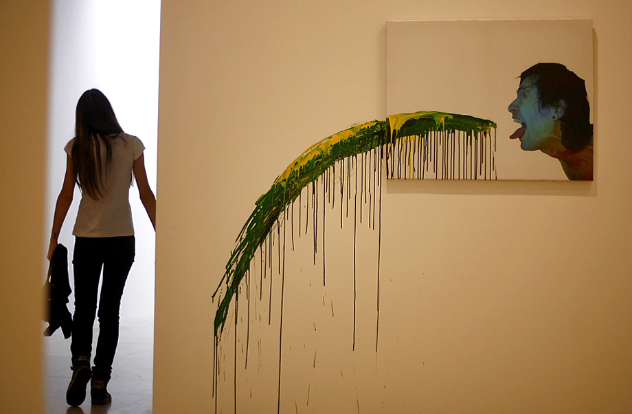 周日(10月11日),塞爾維亞貝爾格萊德舉行的十月藝術(shù)沙龍展上,一名參觀者走過一幅藝術(shù)作品。圖片來源:中國(guó)新聞網(wǎng)