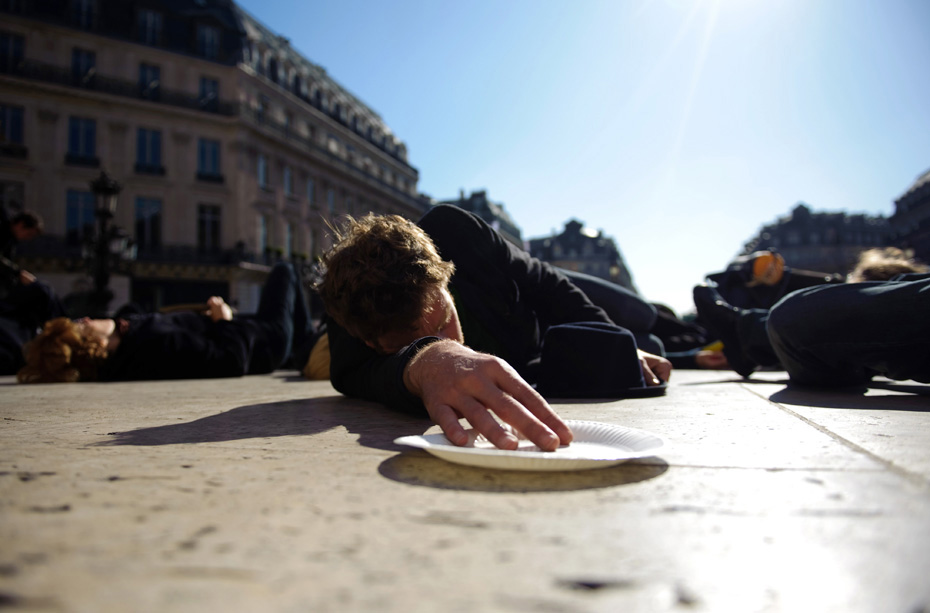 周四(10月15日),示威者身穿黑色衣服、手持空盤子在巴黎歌劇院前抗議。他們此舉是為了呼吁人們關(guān)注世界上的饑民。 10月16日是世界糧食日,今年的主題是“應(yīng)對危機,實現(xiàn)糧食安全”。 圖片來源:中國新聞網(wǎng)