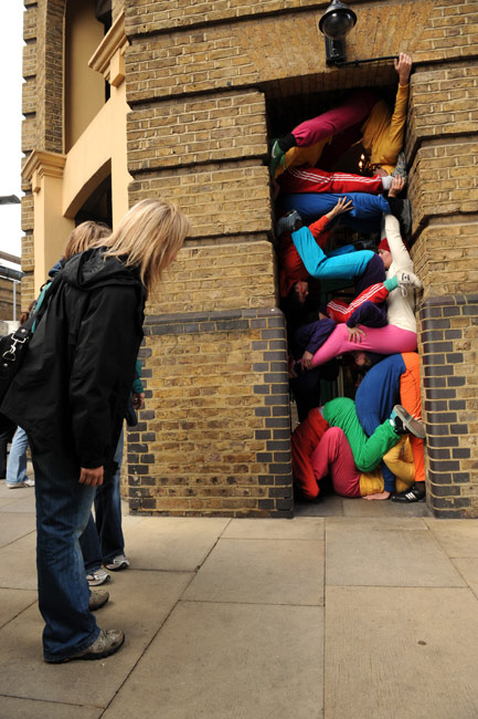 10月16日,來自奧地利的藝術(shù)家威利·多勒帶著他的城市空間人體藝術(shù)團隊,在倫敦街頭進行藝術(shù)表演。幾十位表演者把自己的身體擠進通道入口、壁凹和任何能找得到的公共建筑的縫隙內(nèi),供人們欣賞。