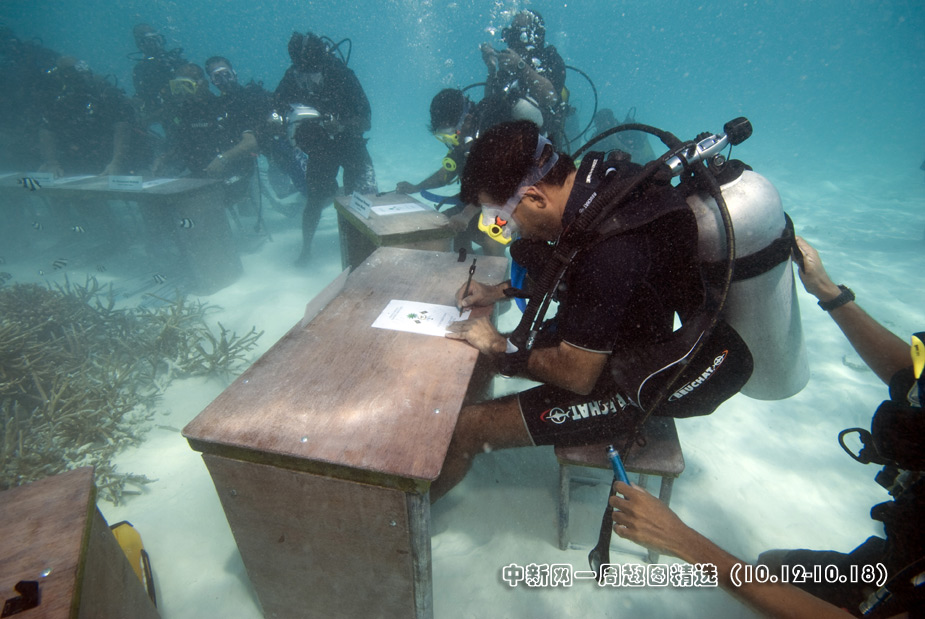 10月17日,印度洋島國(guó)馬爾代夫首次在水下召開內(nèi)閣會(huì)議。圖片來(lái)源:中國(guó)新聞網(wǎng)
