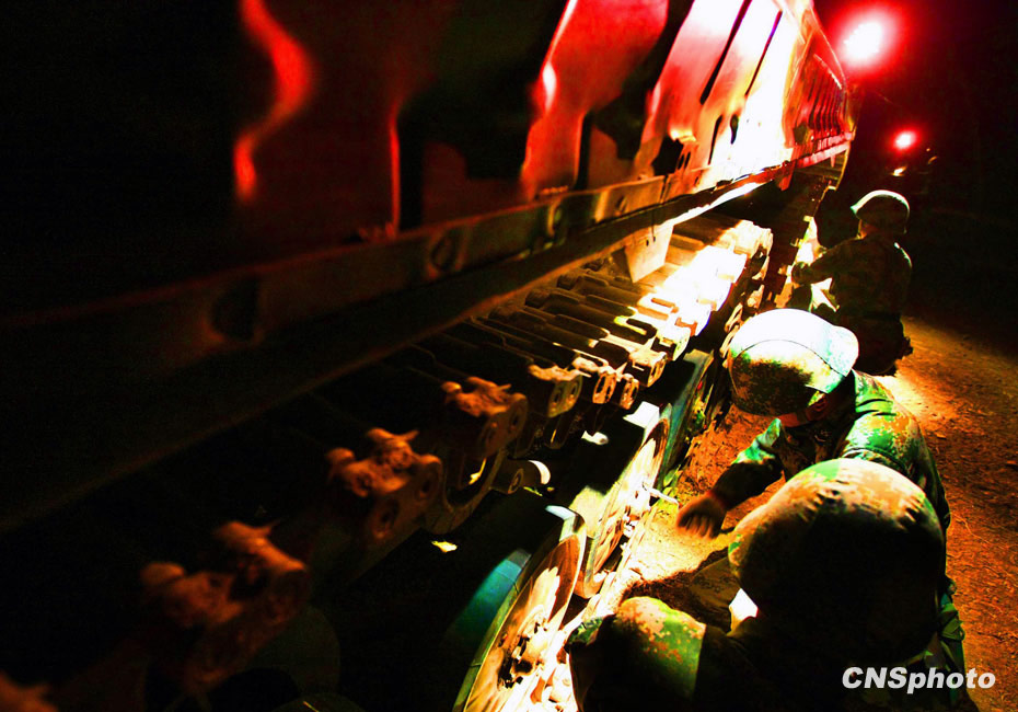 當(dāng)晚國(guó)防大學(xué)防務(wù)學(xué)院、空軍指揮學(xué)院的外軍學(xué)員,以及英國(guó)、以色列、土耳其、巴基斯坦等國(guó)軍事觀察員親臨現(xiàn)場(chǎng)觀摩了后勤保障戰(zhàn)斗準(zhǔn)備、自行榴彈炮占領(lǐng)陣地、裝甲車輛“摸黑”開(kāi)進(jìn)等戰(zhàn)斗要素。圖為后勤保障基地?fù)屝扪b甲戰(zhàn)車。中新社發(fā) 宋吉河 攝