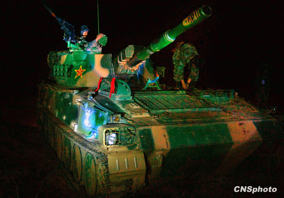 當(dāng)晚國(guó)防大學(xué)防務(wù)學(xué)院、空軍指揮學(xué)院的外軍學(xué)員,以及英國(guó)、以色列、土耳其、巴基斯坦等國(guó)軍事觀察員親臨現(xiàn)場(chǎng)觀摩了后勤保障戰(zhàn)斗準(zhǔn)備、自行榴彈炮占領(lǐng)陣地、裝甲車(chē)輛“摸黑”開(kāi)進(jìn)等戰(zhàn)斗要素。圖為“摸黑”進(jìn)入陣地的主戰(zhàn)坦克。中新社發(fā) 宋吉河 攝
