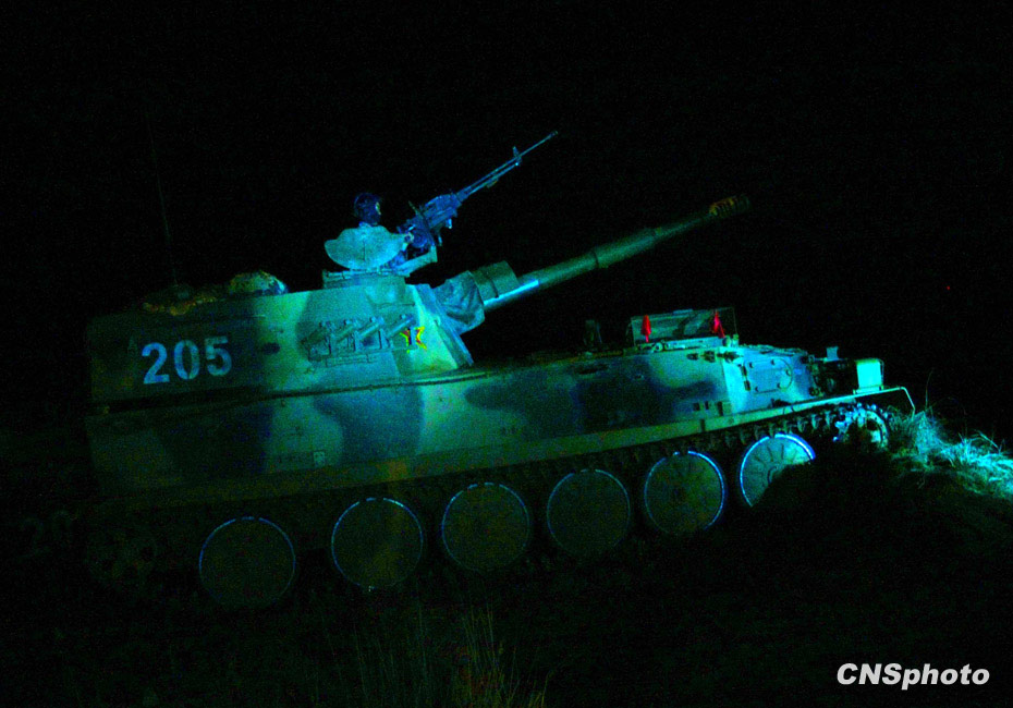 當晚國防大學防務(wù)學院、空軍指揮學院的外軍學員,以及英國、以色列、土耳其、巴基斯坦等國軍事觀察員親臨現(xiàn)場觀摩了后勤保障戰(zhàn)斗準備、自行榴彈炮占領(lǐng)陣地、裝甲車輛“摸黑”開進等戰(zhàn)斗要素。圖為摸黑”開進的裝甲戰(zhàn)車進入戰(zhàn)位。中新社發(fā) 宋吉河 攝