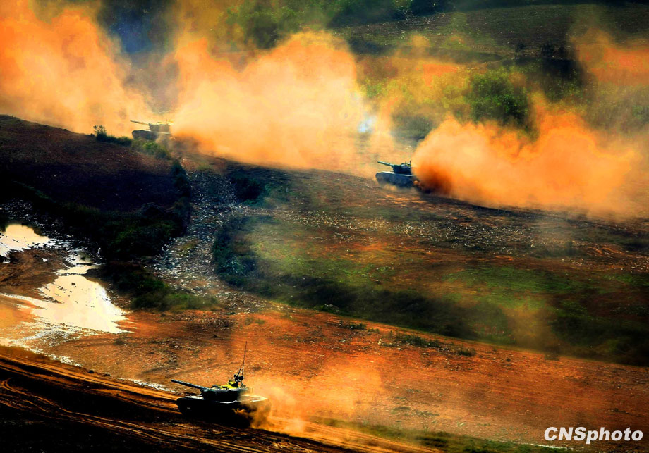 解放軍“前鋒-二00九A”演習(xí),二十二日在濟(jì)南軍區(qū)某合同戰(zhàn)術(shù)訓(xùn)練基地進(jìn)行陸空聯(lián)合火力打擊實(shí)兵實(shí)彈演練。中新社發(fā) 宋吉河 攝
