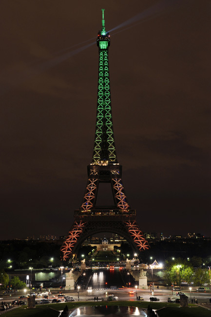 10月22日,法國首都巴黎埃菲爾鐵塔亮起絢麗的燈光,慶祝建成120周年。從當日起至12月31日,埃菲爾鐵塔每晚都會亮起絢麗的燈光。