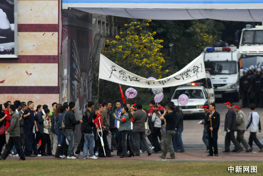 在演練現(xiàn)場,重慶發(fā)生“生化襲擊事件”,偵破工作正在進行時,受害人家屬以賠償和嚴懲兇手為由進行非法游行,堵塞交通和大型商場通道,擾亂交通秩序和正常經(jīng)營,引來大量群眾圍觀。 郝飛 攝