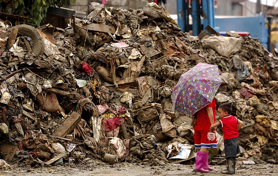 周日(18日),菲律賓馬里基納市一位母親周一帶著孩子走過一堆殘骸。臺風(fēng)“盧碧”使得這個地區(qū)兩次遭遇暴雨侵襲。 來源:中國新聞網(wǎng)