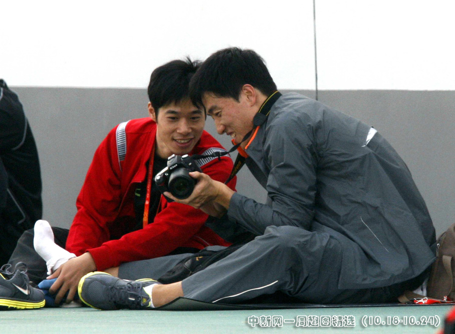 10月22日下午,“飛人”劉翔亮相濟南奧體中心田徑訓(xùn)練場,訓(xùn)練間隙手拿相機,客串?dāng)z影記者。中新社發(fā) 張宇 攝。>>點擊觀看詳細內(nèi)容
