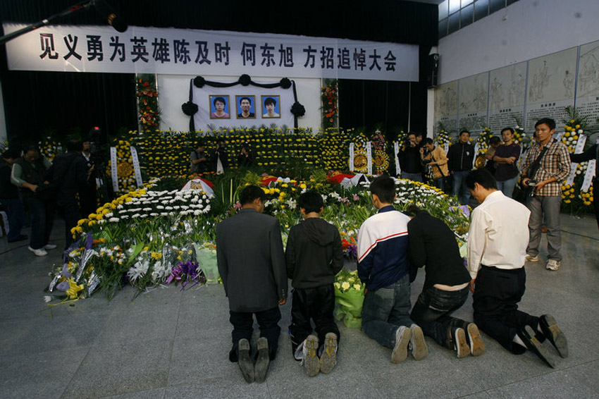 10月28日上午,湖北荊州市在市殯儀館舉行隆重追悼大會(huì),悼念陳及時(shí)、何東旭、方招三位舍己救人大學(xué)生。數(shù)萬(wàn)群眾趕到追悼會(huì)現(xiàn)場(chǎng),手捧菊花為英雄道別。