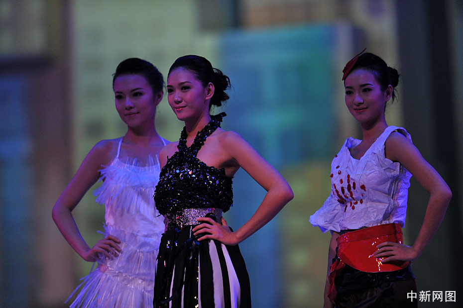 10月31日晚,“2009中華小姐環(huán)球大賽”總決賽上,12名入圍總決賽的佳麗身著各式服裝展現(xiàn)曼妙身姿,此外大賽還設(shè)計了一套“廢品服裝”呼吁環(huán)境保護。中新網(wǎng)記者 金碩 攝