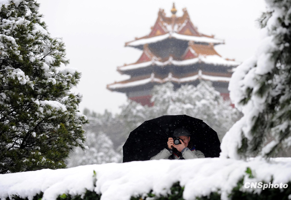 11月1日,深秋的北京大雪紛飛銀裝素裹,一名外國人在故宮角樓附近拍攝雪景。北京今年的初雪時間提前了整整一個月。中新社發(fā) 廖攀 攝