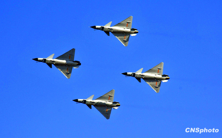 十一月三日,為迎接十一月十一日中國人民解放軍空軍建軍六十周年,空軍八一飛行表演隊和空軍八一跳傘隊在北京沙河機(jī)場舉行了精彩的預(yù)演。圖為殲十戰(zhàn)機(jī)方隊。 中新社發(fā) 潘旭臨 攝