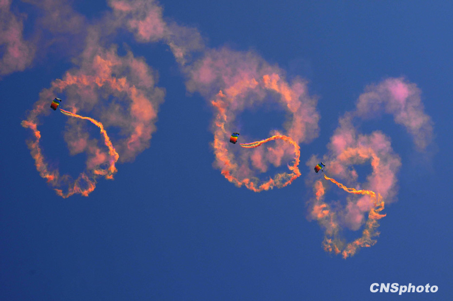 十一月三日,空軍八一飛行表演隊(duì)和空軍八一跳傘隊(duì)在北京沙河機(jī)場(chǎng)舉行預(yù)演,迎接十一月十一日中國(guó)人民解放軍空軍建軍六十周年。圖為空軍八一跳傘隊(duì)表演。中新社發(fā) 潘旭臨 攝