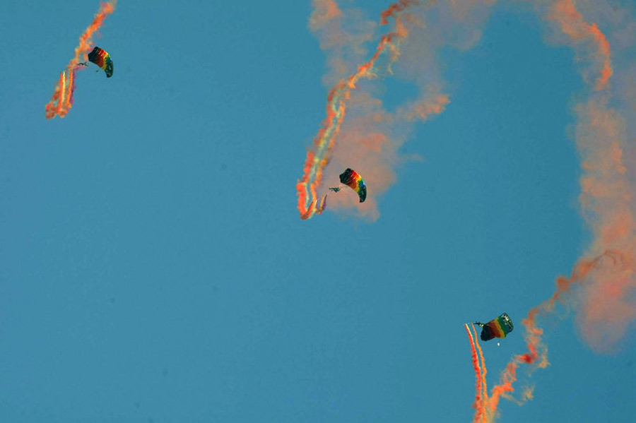 11月3日上午,慶祝空軍建軍60周年空中表演在沙河機(jī)場舉行首場預(yù)演。八一跳傘隊(duì)共有24名隊(duì)員表演開路先鋒、空中彩虹、歡慶盛典和仙女下凡4個(gè)節(jié)目。黑克 張穎川 攝