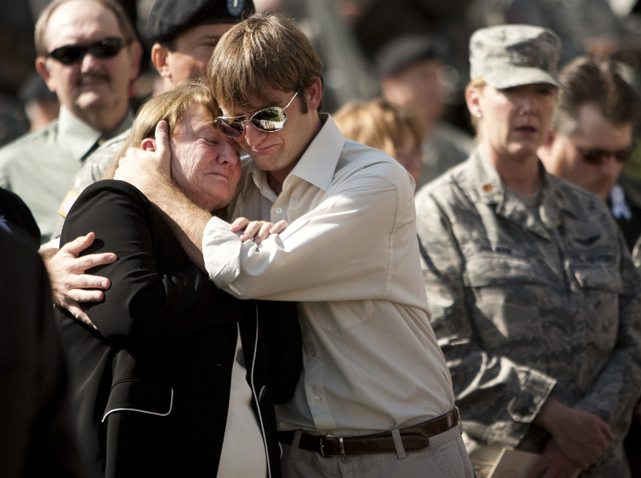 2009年11月10日,在美國(guó)得克薩斯州胡德堡陸軍基地,槍擊案遇害士兵的親屬參加悼念儀式。當(dāng)日,美國(guó)德克薩斯州胡德堡陸軍基地舉行儀式悼念槍擊案遇難者。 圖片來源:中國(guó)新聞網(wǎng)