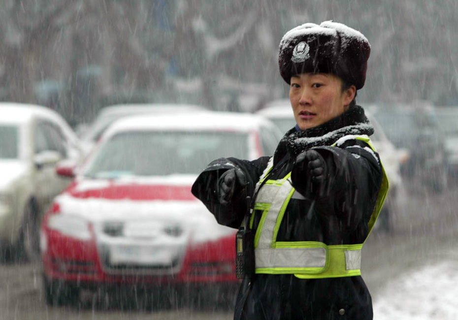 11月12日,在濟南市經(jīng)七緯二路口,濟南市公安局交警支隊市中大隊女子中隊民警黃雷冒雪疏導交通。袁鵬 攝