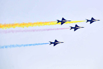 慶祝中國人民解放軍空軍成立60周年飛行表演,11月15日上午在北京沙河機場舉行。表演按八一飛行表演隊4架殲-10飛機表演12個動作和6架殲-7GB飛機表演15個動作,分四機對頭交叉、四機菱形隊大坡度盤旋、單機小速度平飛等27個動作,其中四機對頭交叉動作是這次表演中技術(shù)難度較大的動作之一,這是國產(chǎn)三代飛機和國產(chǎn)二代飛機首次同場競技表演。圖為八一飛行隊殲-10進行表演。中新社發(fā) 宋吉河 攝