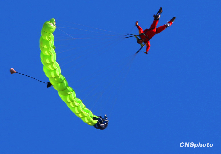 慶祝中國人民解放軍空軍成立60周年飛行表演,11月15日上午在北京沙河機(jī)場舉行。表演按八一飛行表演隊(duì)4架殲-10飛機(jī)表演12個動作和6架殲-7GB飛機(jī)表演15個動作,分四機(jī)對頭交叉、四機(jī)菱形隊(duì)大坡度盤旋、單機(jī)小速度平飛等27個動作,其中四機(jī)對頭交叉動作是這次表演中技術(shù)難度較大的動作之一,這是國產(chǎn)三代飛機(jī)和國產(chǎn)二代飛機(jī)首次同場競技表演?哲娞鴤氵\(yùn)動大隊(duì)30名運(yùn)動員表演了4個跳傘科目。中新社發(fā) 宋吉河 攝