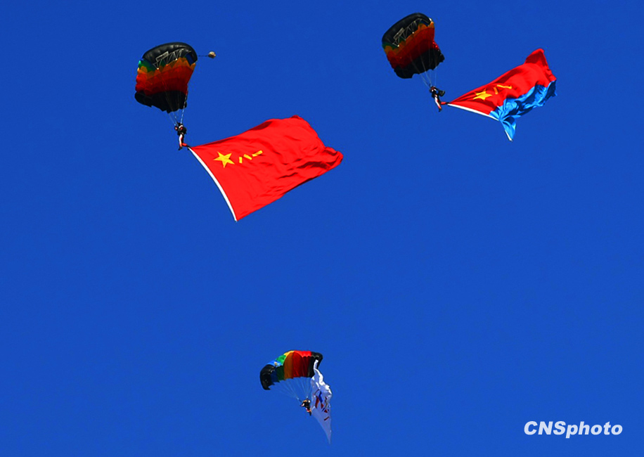 慶祝中國人民解放軍空軍成立60周年飛行表演,11月15日上午在北京沙河機(jī)場舉行。表演按八一飛行表演隊(duì)4架殲-10飛機(jī)表演12個(gè)動作和6架殲-7GB飛機(jī)表演15個(gè)動作,分四機(jī)對頭交叉、四機(jī)菱形隊(duì)大坡度盤旋、單機(jī)小速度平飛等27個(gè)動作,其中四機(jī)對頭交叉動作是這次表演中技術(shù)難度較大的動作之一,這是國產(chǎn)三代飛機(jī)和國產(chǎn)二代飛機(jī)首次同場競技表演?哲娞鴤氵\(yùn)動大隊(duì)30名運(yùn)動員表演了4個(gè)跳傘科目。中新社發(fā) 宋吉河 攝