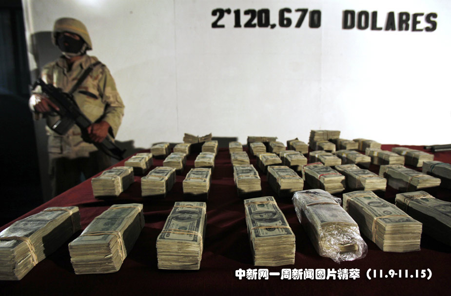12日(周四),墨西哥軍方展示繳獲的贓款。圖片來(lái)源:中國(guó)新聞網(wǎng)