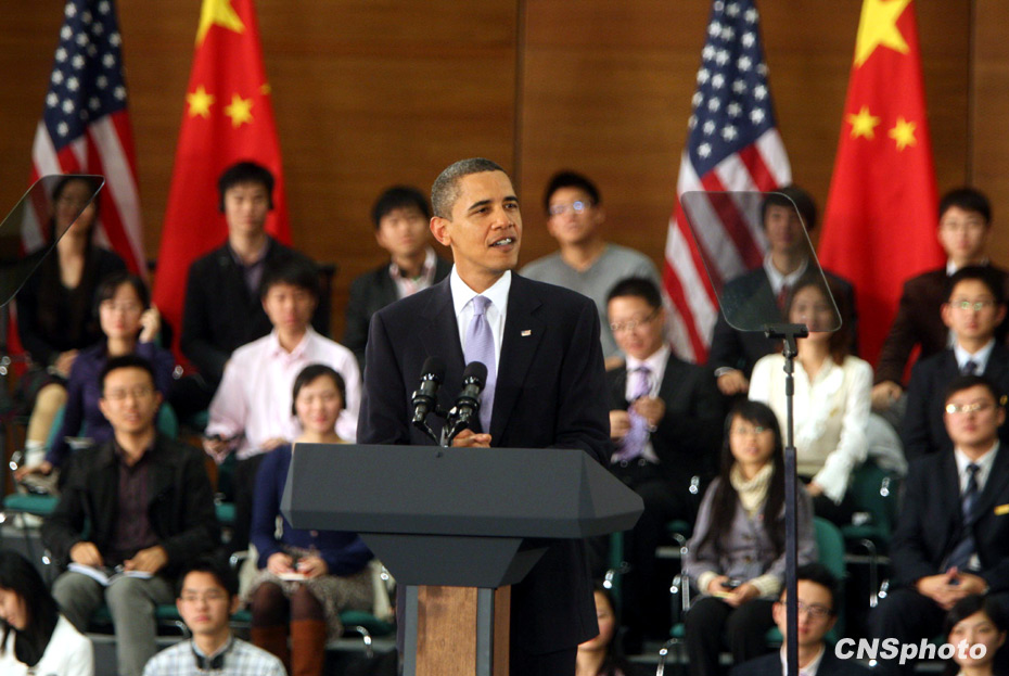 11月16日,正在上海訪問的美國總統(tǒng)奧巴馬現(xiàn)身位于浦東的上?萍拣^,與四百余中國青年進(jìn)行面對(duì)面交流。 圖片來源:中國新聞網(wǎng)