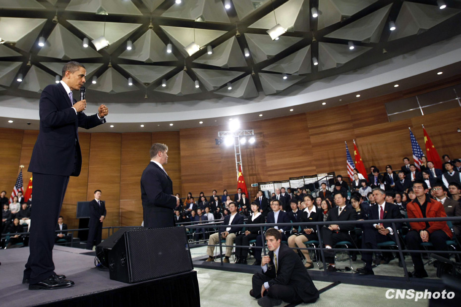 11月16日,正在中國進行國事訪問的美國總統奧巴馬,在上海就與中國青年交流,并現場回答提問。中新社發(fā) 盛佳鵬 攝