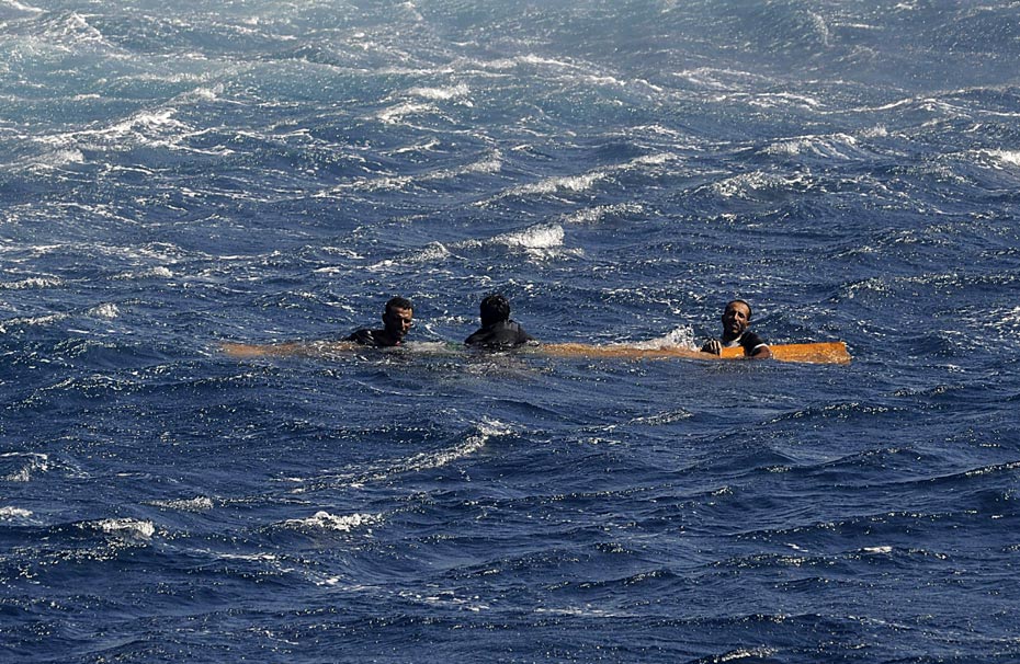 11月17日,亞丁灣,3名漁民抱著木板在海面上漂流3天后獲救。據(jù)悉,他們?cè)庥隽耸畮酌伤坪1I的劫持,海盜們讓其選擇或跳海逃生或被殺死。圖片來源:中國(guó)新聞網(wǎng)