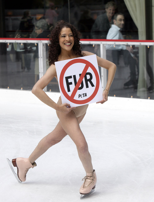 11月24日,美國花樣滑冰的傳奇人物、1979年世界花滑錦標(biāo)賽冠軍得主芭比洛尼在紐約洛克菲勒廣場復(fù)出“裸滑”。這次表演是為了支持善待動物協(xié)會的反對皮草行動。