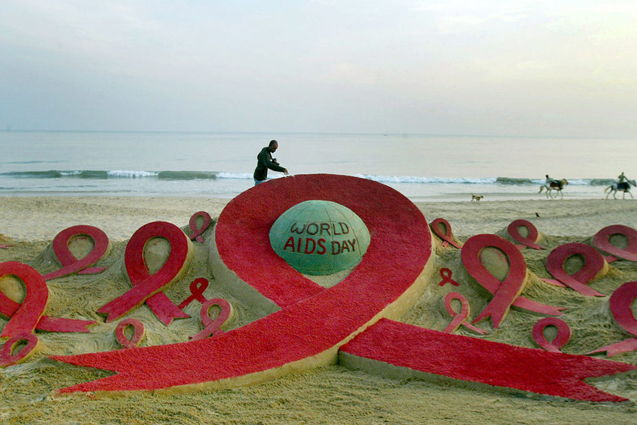 11月30日,印度邦布里,一名藝術家為世界艾滋病日在海灘上制作了紅絲帶主題沙雕。12月1日是世界艾滋病日,2009年世界艾滋病日的主題是“普遍可及和人權”。世界各地民眾組織各種活動呼吁人們關注艾滋病。圖片來源:中國新聞網