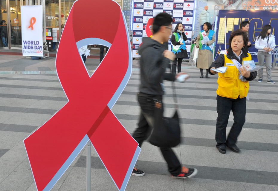 11月30日,韓國首爾,紅十字會工作人員在街頭放置紅絲帶標(biāo)識宣傳世界艾滋病日。12月1日是世界艾滋病日,2009年世界艾滋病日的主題是“普遍可及和人權(quán)”。世界各地民眾組織各種活動呼吁人們關(guān)注艾滋病。圖片來源:中國新聞網(wǎng)