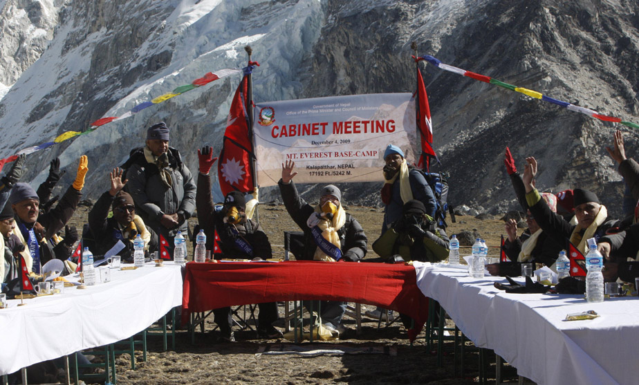 12月4日,尼泊爾總理和22位部長在喜馬拉雅山海拔5262米的高度舉行內(nèi)閣會議,討論全球變暖對喜馬拉雅山的影響。呼吁人們切實(shí)采取行動(dòng),保護(hù)環(huán)境。