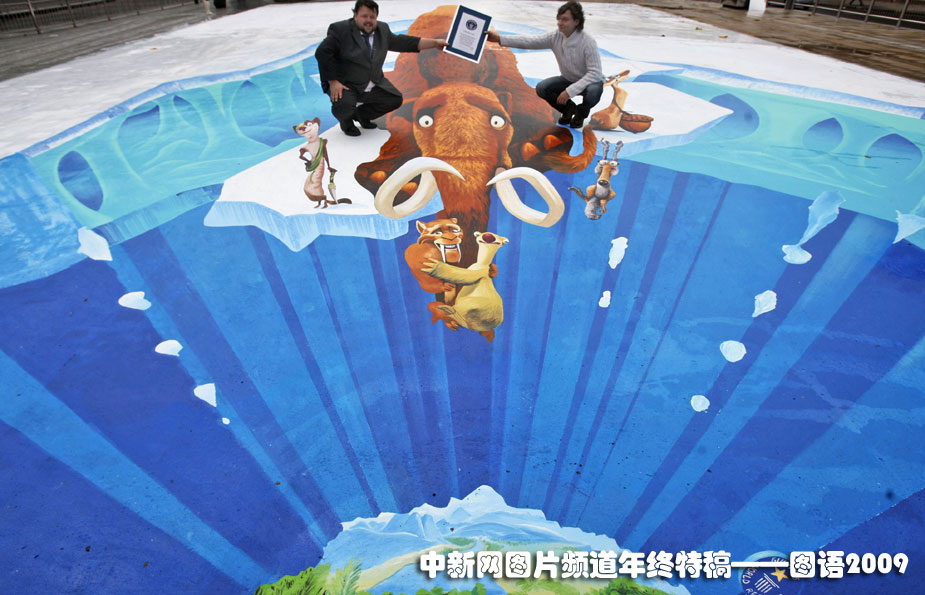 世界最大的3D立體畫:11月23日,德國街頭畫家埃德加·穆勒在英國倫敦一家購物中心展示他以動畫電影《冰河時代3》為主題創(chuàng)作的大型立體畫。這幅立體畫占地320平方米,創(chuàng)造了新的吉尼斯世界紀錄,給人們帶來妙趣橫生的視覺體驗。圖片來源:中國新聞網(wǎng)