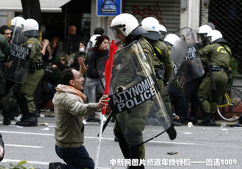 12月6日,一名抗議者在警察面前下跪。雅典警察開槍打死一名15歲少年事件一周年,希臘各地舉行悼念活動(dòng)和爆發(fā)游行示威。