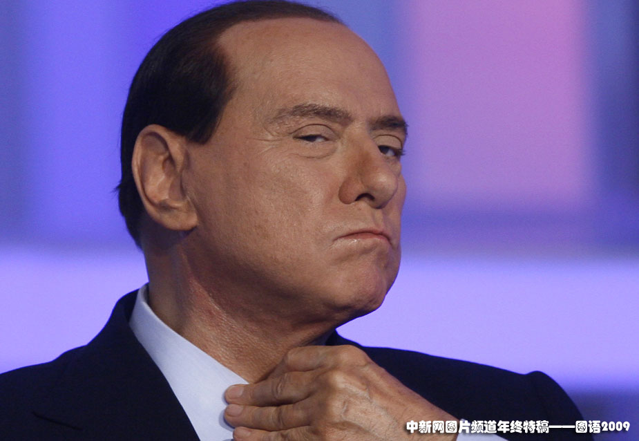 瀟灑的貝魯斯科尼:2009年9月25日,意大利總理貝魯斯科尼在接受電視采訪(fǎng)時(shí)整理領(lǐng)帶。貝魯斯科尼一直緋聞纏身,妻子也離他而去。