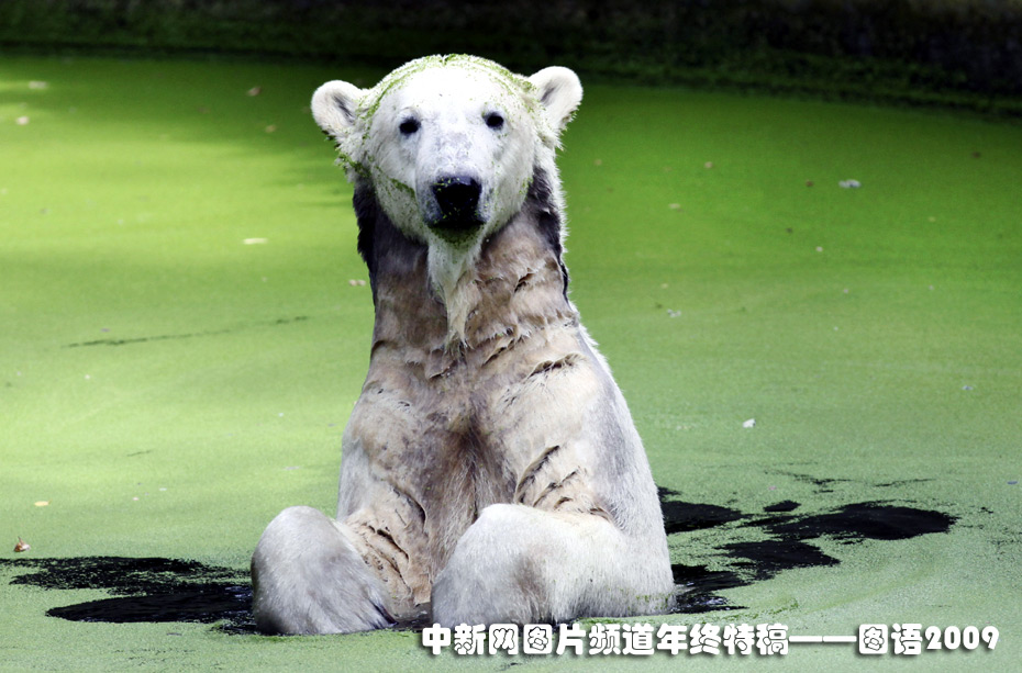 德國柏林動物園的明星北極熊克努特正在水中“自娛自樂”。