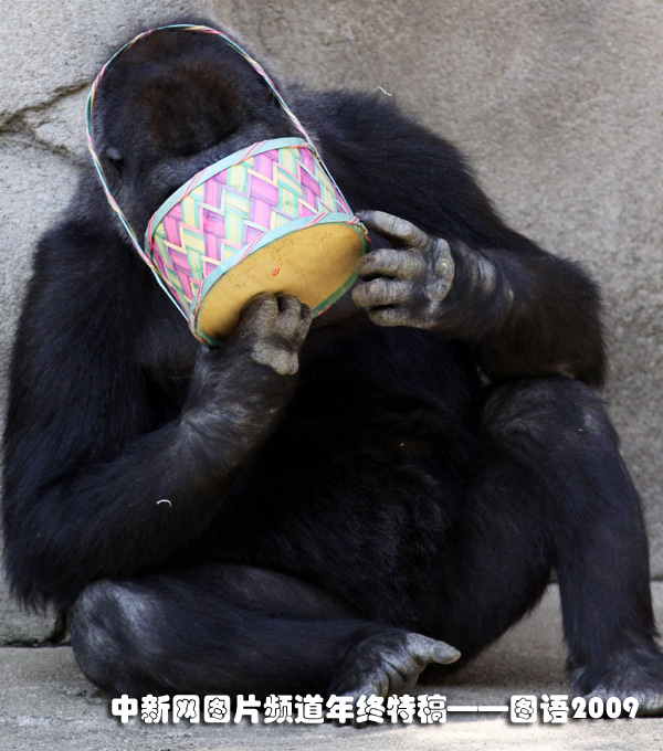 為慶祝復(fù)活節(jié),美國辛辛那提動(dòng)物園為大猩猩喬莫肯準(zhǔn)備了一提籃食物。喬莫肯在吃完全部食物后,還意猶未盡地企圖再翻出一些其它的食物。