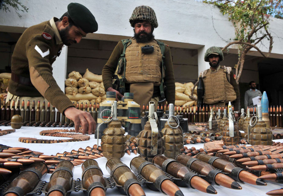 12月12日,在巴基斯坦西北部開伯爾部落地區(qū),巴基斯坦軍方抓獲多名塔利班武裝分子,繳獲大量軍火。圖片來(lái)源:中國(guó)新聞網(wǎng)
