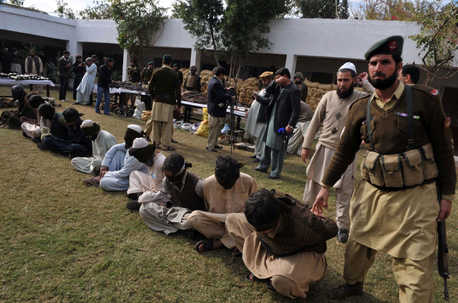 12月12日,在巴基斯坦西北部開伯爾部落地區(qū),巴基斯坦軍方抓獲多名塔利班武裝分子,繳獲大量軍火。圖片來源:中國新聞網