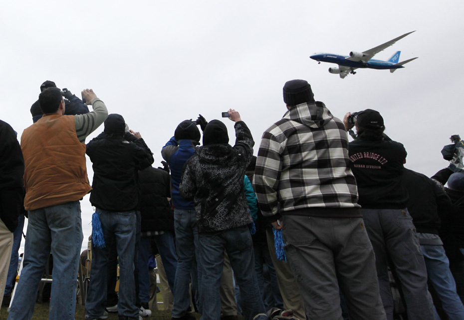 12月15日,延遲兩年多之后,美國(guó)波音公司最新夢(mèng)幻客機(jī)波音787終于在華盛頓州升空試飛,兩萬(wàn)五千多人忍受寒冷觀看了試飛過(guò)程。來(lái)源:中國(guó)新聞網(wǎng)