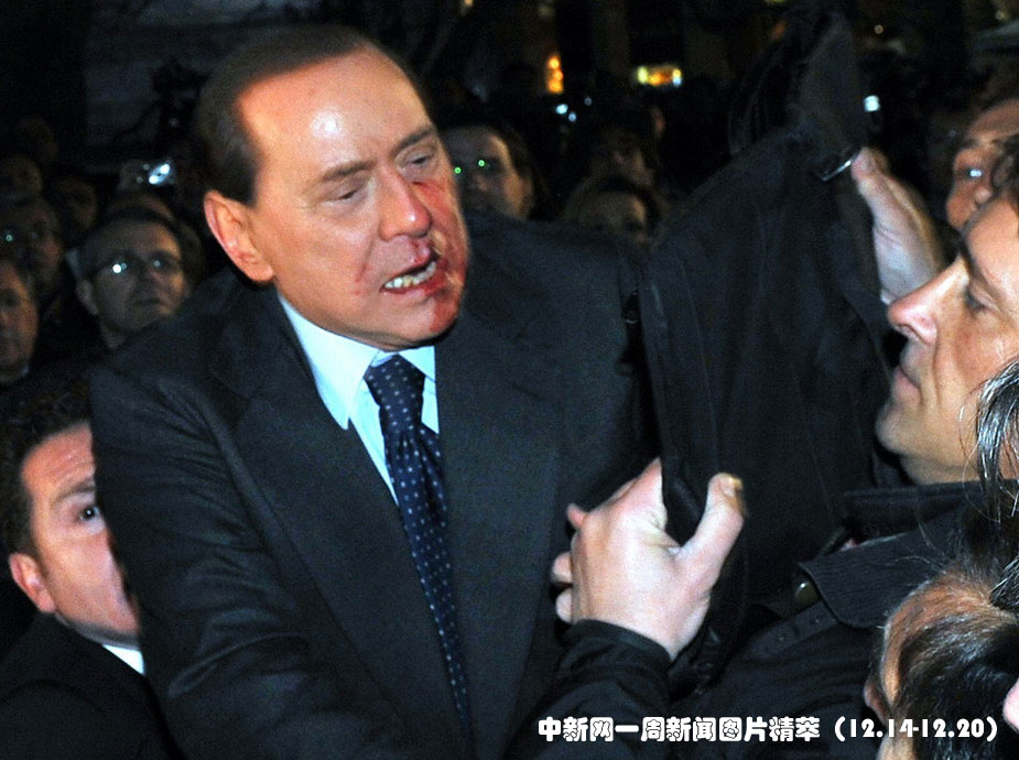 13日(周日)晚間,意大利總理貝盧斯科尼受邀在米蘭參加一個(gè)集會(huì)時(shí)遭到襲擊,面部受傷流血,隨后被緊急送醫(yī)治療。圖片來(lái)源:中國(guó)新聞網(wǎng)