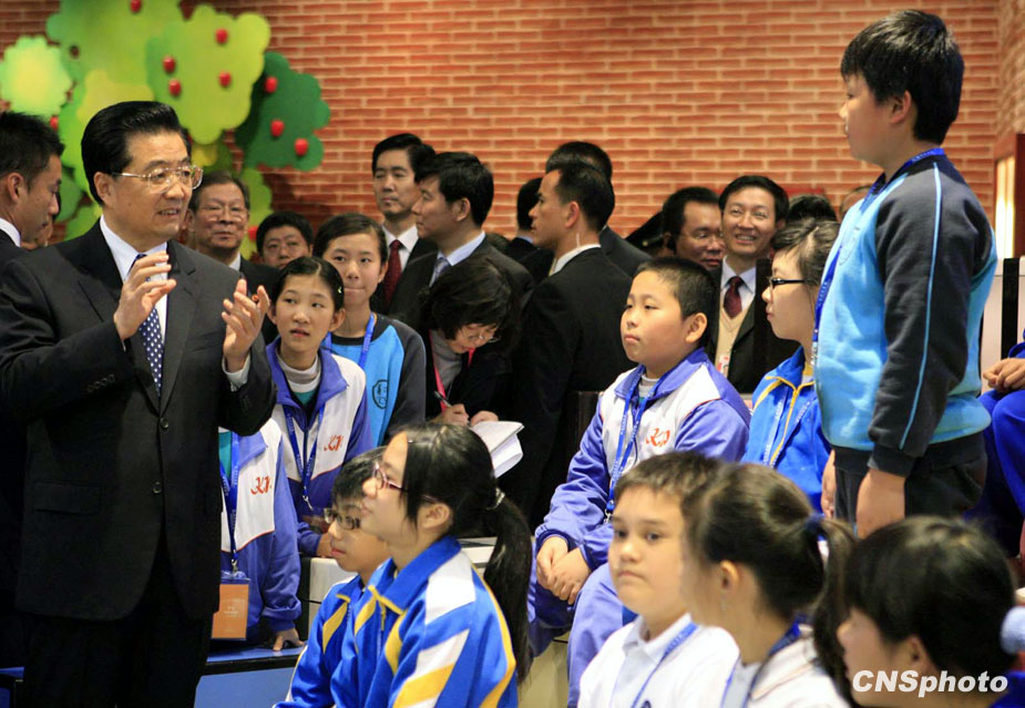 12月19日下午,國家主席胡錦濤在澳門特首何厚鏵陪同下參觀澳門科學館,并與當?shù)貙W生親切交流。中新社發(fā) 張勤 攝